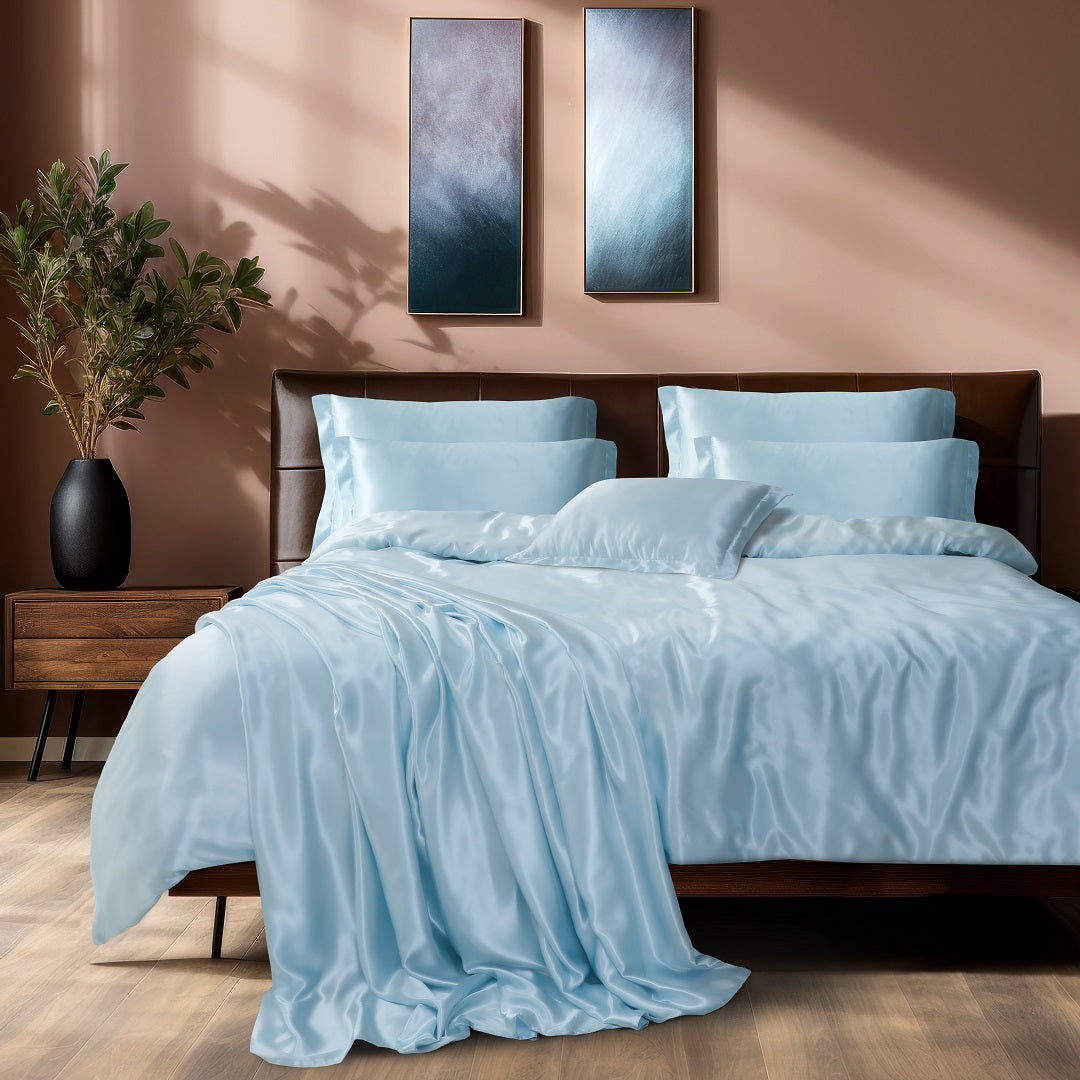 Elevate your sleep sanctuary with celeste glow, a luxurious 8-pieces bed set crafted from ultra-soft fabric in a serene sky blue hue. Designed to exude elegance and tranquility—all offering a smooth, silky finish that pampers your skin and enhances your bedroom’s aesthetic. Perfect for those who crave both comfort and style, Celeste Glow reflects light beautifully, adding a gentle shimmer to your space and ensuring a blissful night’s rest.